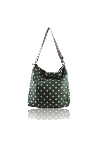 Látková taška tmavě zelená s bílým puntíkem, barevný nastavitelný popruh, v přední části tašky 2 kapsy se zapínáním na druky, v zadní části kapsa na zip, vnitřní zapínání na zip, uvnitř větší kapsa na zip, kapsa na mobil a kapsa na drobností, béžová podšívka s růžemi, velikost tašky 35x34x9 cm,..