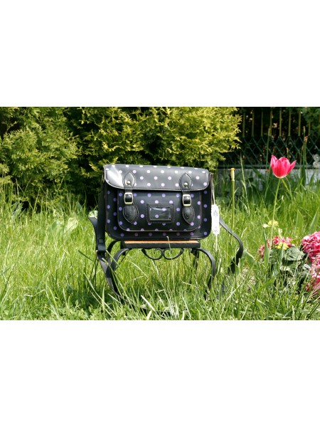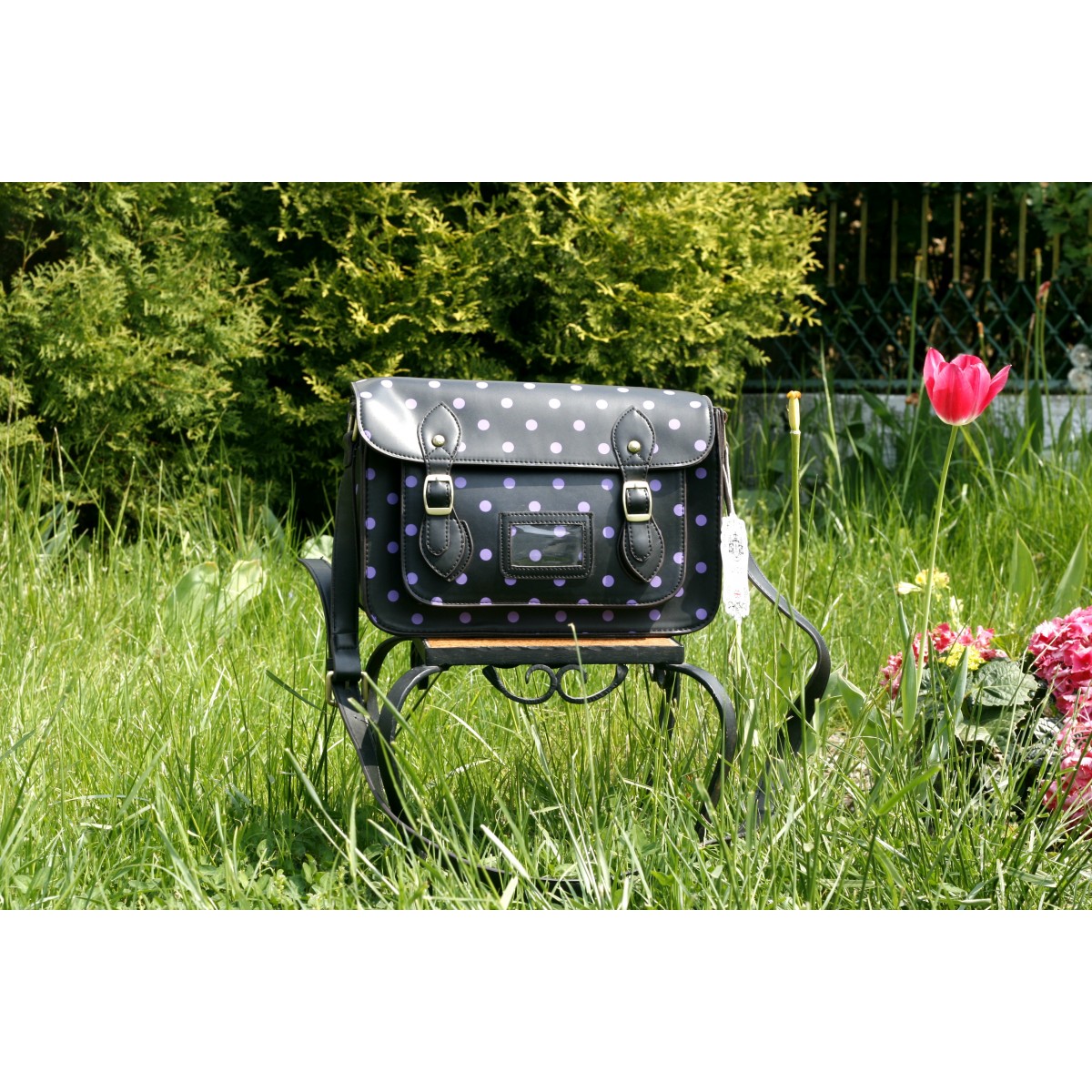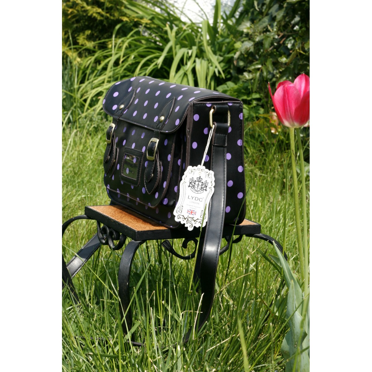 U tohoto zbožíČerná kabelka s fialovými puntíky značka LYDC dovoz velká Británie, v přední části pod přezkami velká kapsa, vnitřní zapínání na zip, vnější na magnety, uvnitř kabelky kapsa na zip a 2 kapsy na mobil a jiné drobnosti, součástí nastavitelný popruh 70/140 cm, šířka 2,5 cm, velikost kabelky 30x21x11 cm, podšívka černý satén s potiskem loga LYDC, vnější zapínání pod přezkami na magnet, materiál umělá kůže