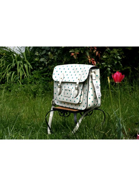 Krémová kabelka se zelenými puntíky značka LYDC dovoz velká Británie, v přední části pod přezkami velká kapsa, vnitřní zapínání na zip, vnější na magnety, uvnitř kabelky kapsa na zip a 2 kapsy na mobil a jiné drobnosti, součástí nastavitelný popruh 70/140 cm, šířka 2,5 cm, velikost kabelky 35x30x11 cm, podšívka béžový satén s potiskem loga LYDC, vnější zapínání pod přezkami na magnet, materiál umělá kůže
