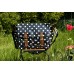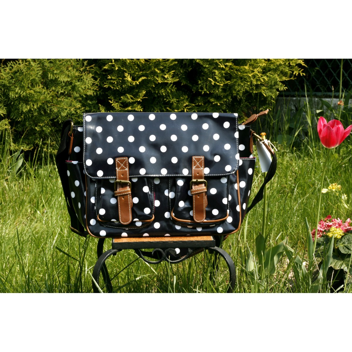 Černá taška s bílým puntíkem, celé zdobeno hnědým lemováním, vpředu hnědé přezky a zapínání na magnety, v přední části 2 kapsy, vevnitř zapínání na zip, kapsa na zip a 2 malé kapsy na mobil a drobnosti, ze zadní části kabelky ještě kapsa na zip, podšívka růžový satén, popruh přes rameno s nastavitelnou délkou, velikost tašky 32x25x11 cm, umělá kůže